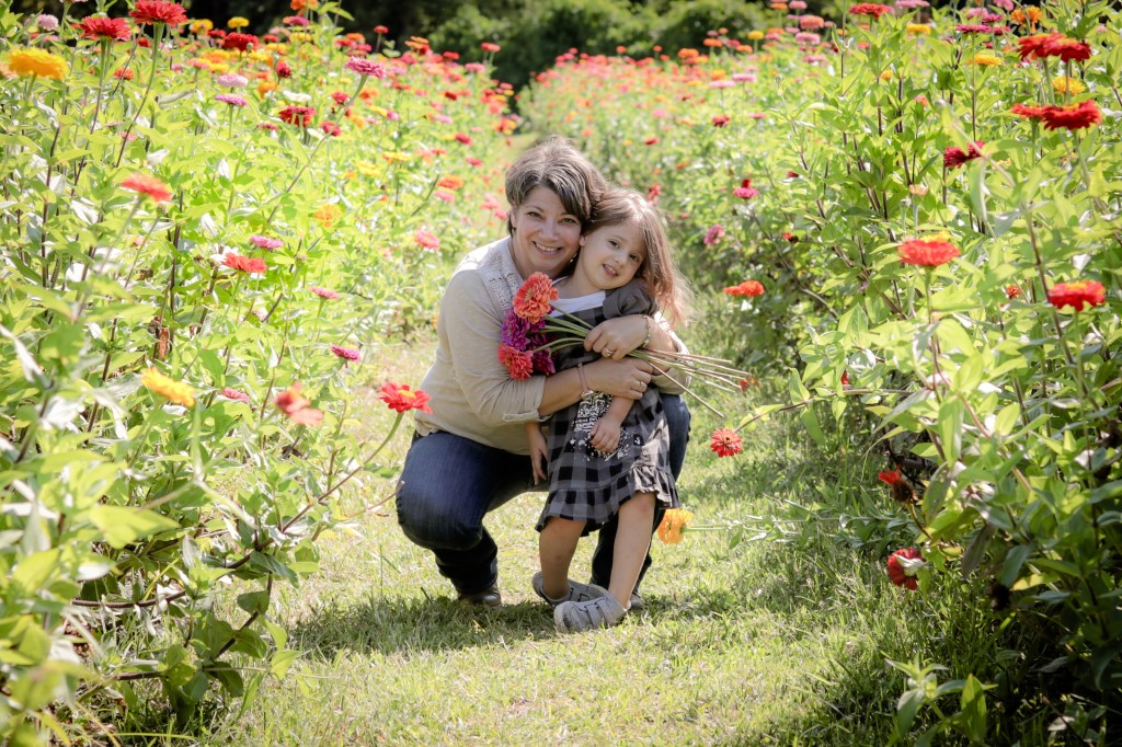 My sister offered to do a photo shoot for my website at a local zinnia farm (four years ago this week). I took my granddaughter Emma along to get some pictures with her too. She loved all the bright flowers and being the center of attention. This photo is one of my favorites of us together. The farm was beautiful and a perfect location for photos.